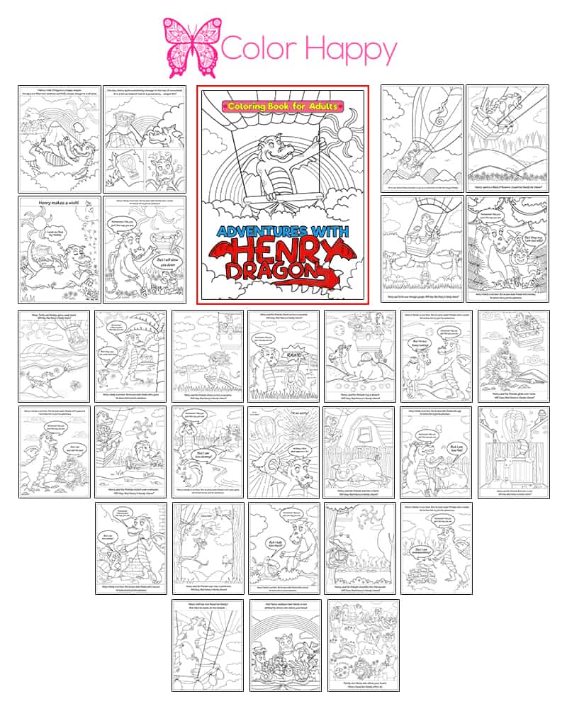 Henry Dragon is the last of his kind, and is perfectly content – until he finds a hot air balloon with instructions written in dragon! Henry sets off on a whirlwind hot-air balloon adventure all around the world to look for his long-lost family. Along the way, he meets many friends who join him on his quest. Color Henry and his animal friends as they soar across the sky!