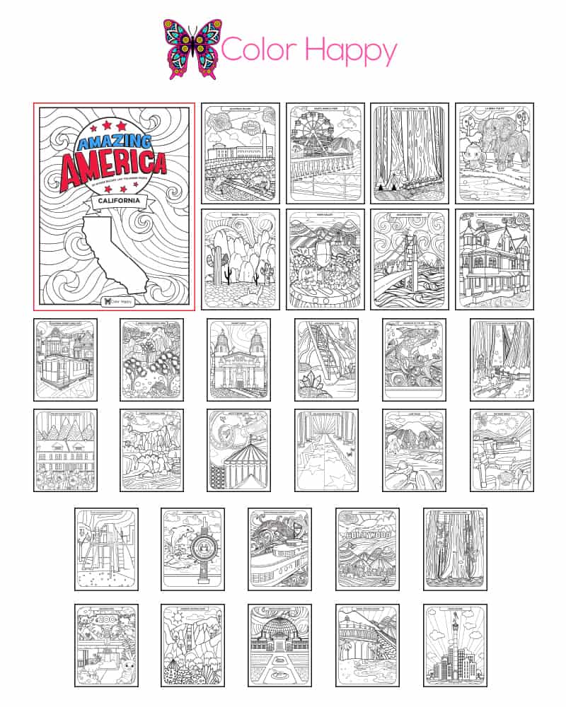 We selected 30 California tourist attractions that are fun to color, ranging from State and National Parks, to must-see touristy places, and a few wacky roadside attractions.