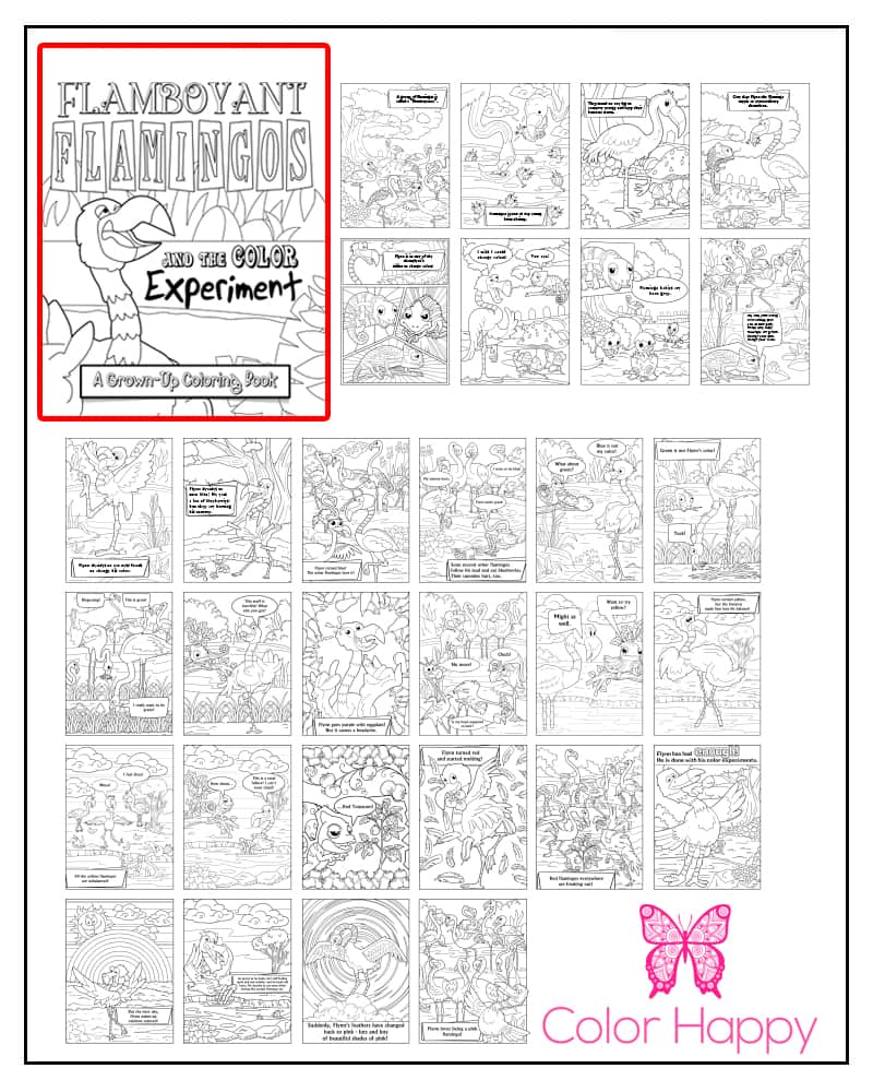 Flynn Flamingo is bored with pink so he sets out to start a color revolution! Soon flamingos are turning up blue and green and yellow and red – with unintended consequences. Color along with all the flamingo fun as these birds make their way through a color identity crisis.