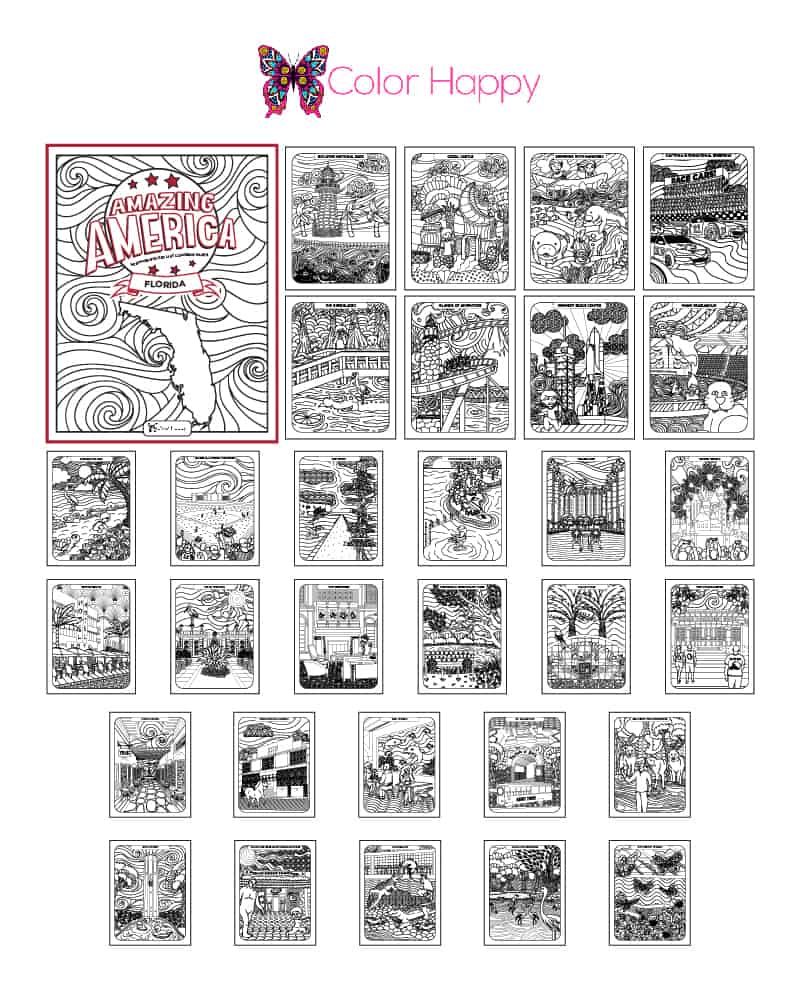 We selected 30 Florida tourist attractions that are fun to color, ranging from State and National Parks, to must-see touristy places, and a few wacky roadside attractions.