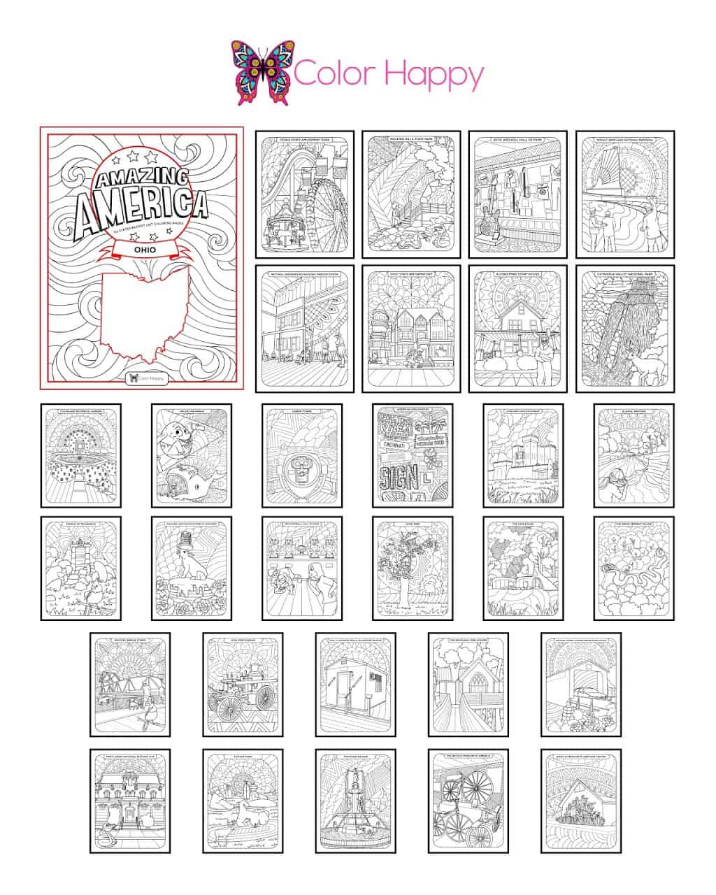 We selected 30 Ohio tourist attractions that are fun to color, ranging from State and National Parks, to must-see touristy places, and a few wacky roadside attractions.