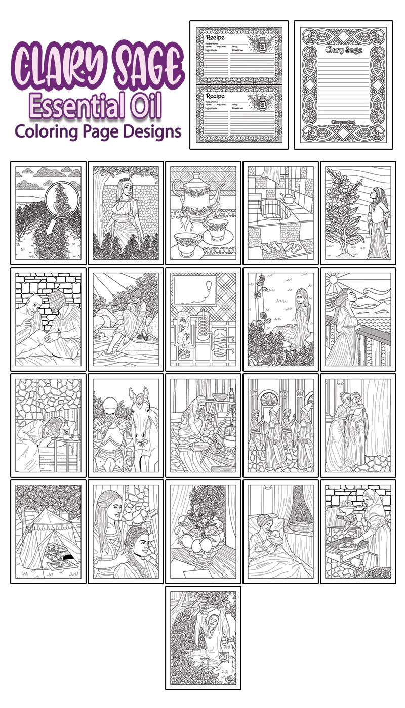 Explore clary sage essential oil throughout the middle-ages in color. Each of these 30 pages is dedicated to learning more about aromatherapy, specifically clary sage essential oil, and it’s history, science, chemistry, common uses, and even recipes, all while providing fun and detailed coloring elements designed to embody medieval times.