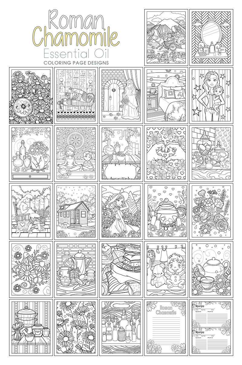 Roman Chamomile Essential Oil coloring pages explores different aspects of Roman Chamomile – the history, science, uses, and more, all while providing fun and detailed coloring elements. The Roman Chamomile Essential Oil package includes quotes, and recipes, and a nature journal page, all themed for Roman Chamomile.